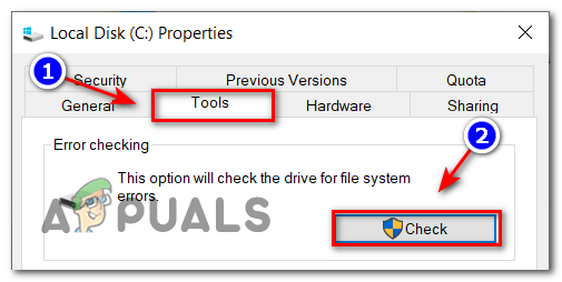 Opening the Properties screen of the drive - Click on Tools, and after that click on Check.
