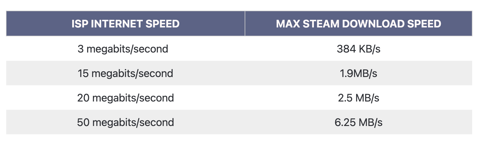 Steam measures its downloads in multiples of “bytes” per second instead of “bits” per second. A network provider mostly uses bits per second as a measure to advertise their internet connection. A byte is a group of 8 bits.