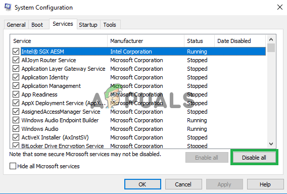 Pressing the “Windows” + “R” Key simultaneously - Click on the “Services” tab and uncheck the “Hide all Microsoft Services” option.