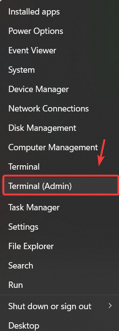 - Right-click the Start Menu and select Terminal (Admin) to open the command prompt.