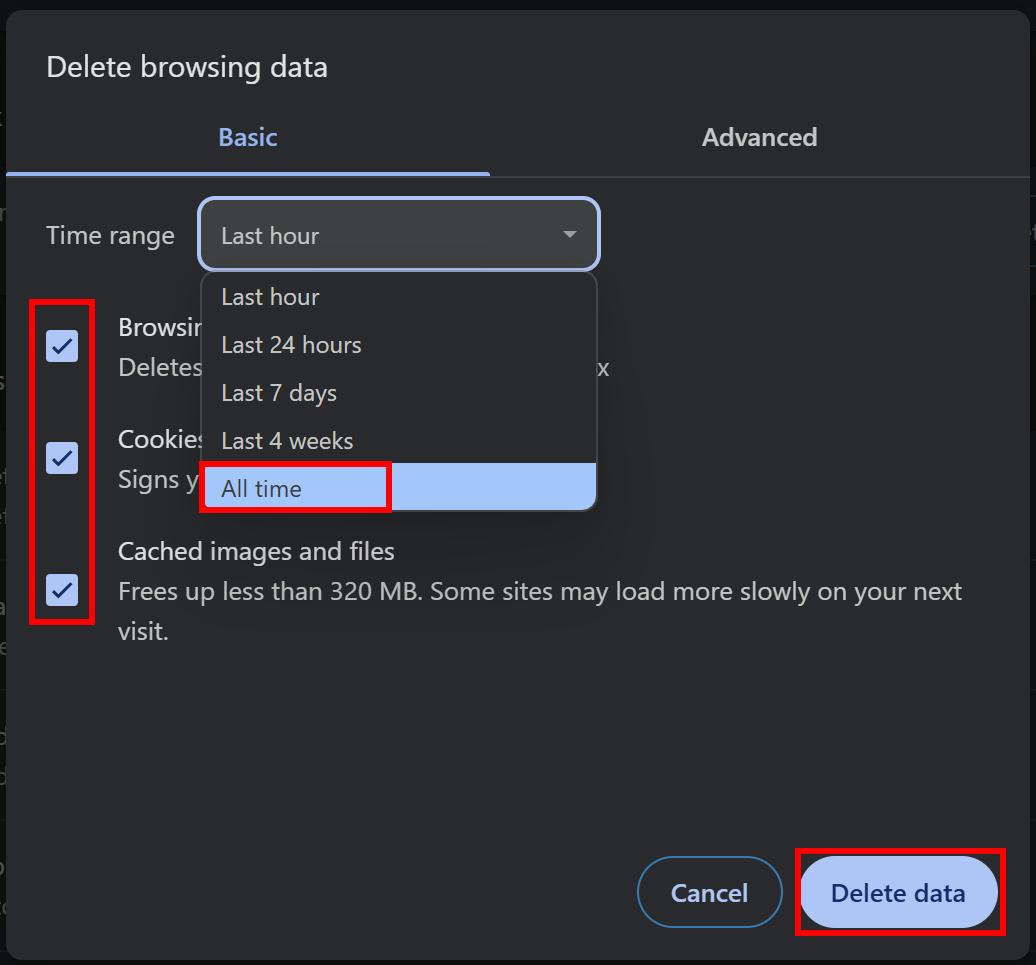 - Check all the boxes for the data you want to clear, and set the Time range to All time.