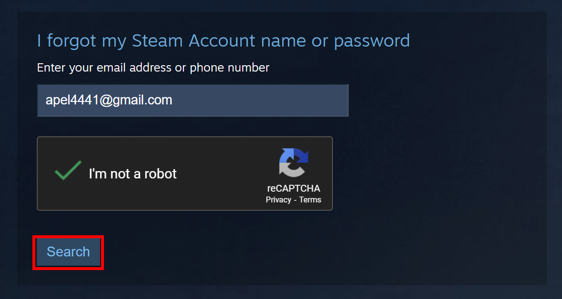 - Enter the email address or phone number linked to your Steam account and click Search.