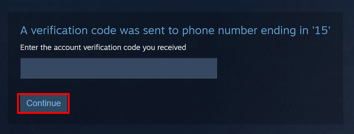 - Steam will send a verification code to your email or phone. Enter the code in the provided field and click Continue.