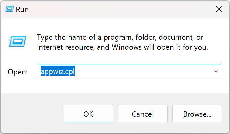 - Type appwiz.cpl and press Enter to open the Programs and Features window.