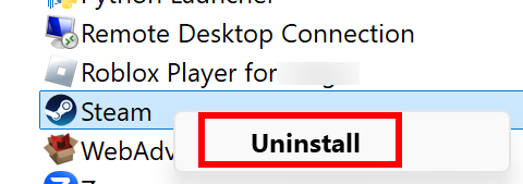- Right-click on Steam and select Uninstall.