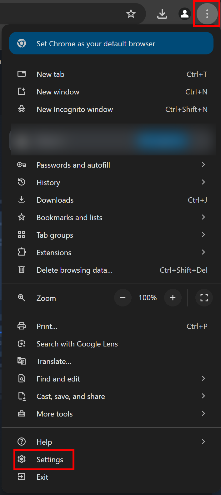 - Open your browser (e.g., Google Chrome), click on the three-dot menu located at the top-right corner, and select Settings.