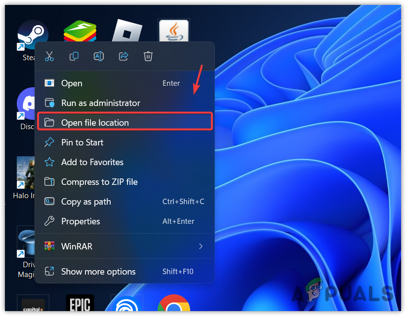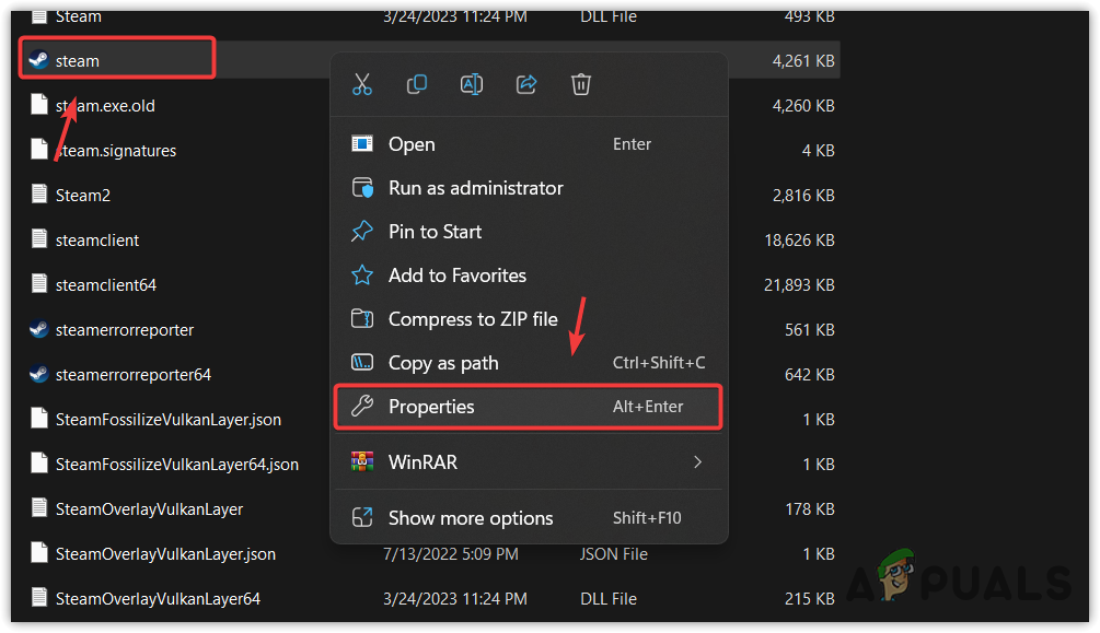- Right-click the Steam shortcut from the desktop and select Open file location or go to the Steam application directory and right-click on it.