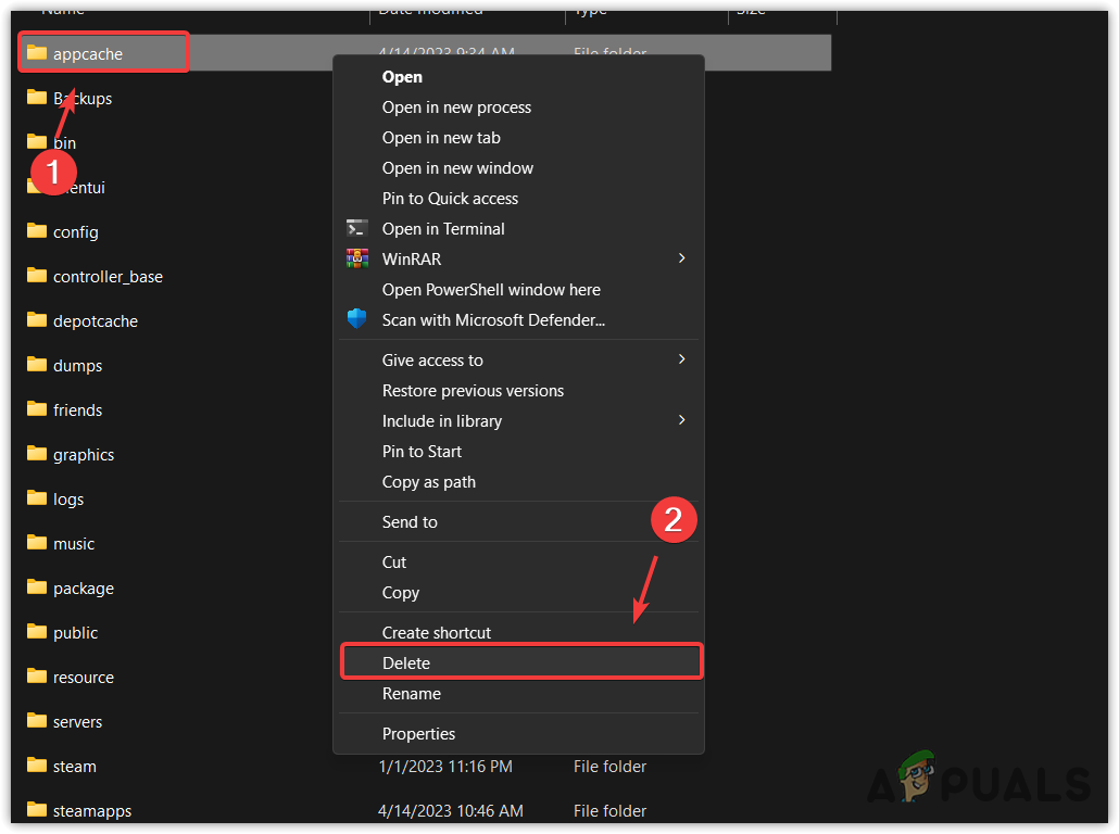 - Here Select the appcache folder and press Delete on your keyboard.
