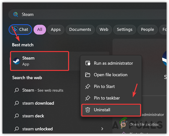 - To reinstall Steam, click Start Menu and type Steam.