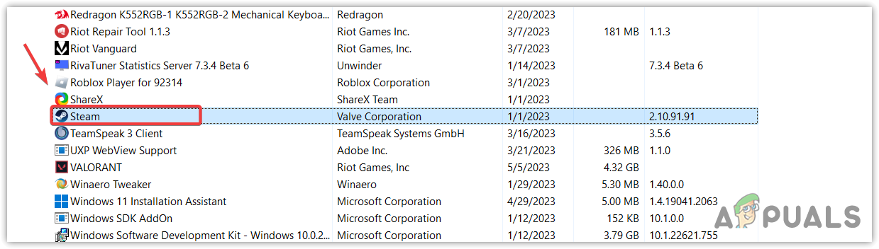- Right-click Steam and click Uninstall. This will take you to the control panel programs and features.
