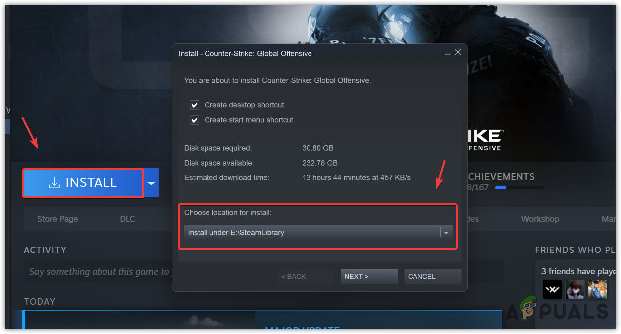 - Once done, download and install Steam. Then go to Library, click Install, then select your game library to discover the existing files of the game to install.