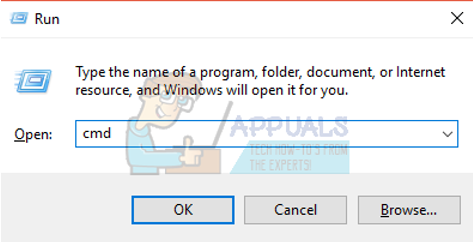 - After performing the above actions, press Windows + R button to pop up the Run window again. In the dialogue box type “cmd” to bring up the command prompt.