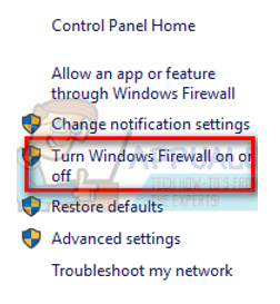 - Now at the left side, click the option which says “Turn Windows firewall on or off”. Through this, you can turn your firewall off easily.