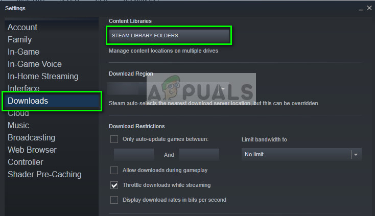 Navigate to Steam settings by clicking Steam from the homepage and clicking Settings. Once in the Settings, open the Downloads tab present at the left side of the interface.