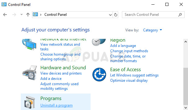 - In Control Panel, select to View as: Category at the top right corner and click on Uninstall a Program under the Programs section.