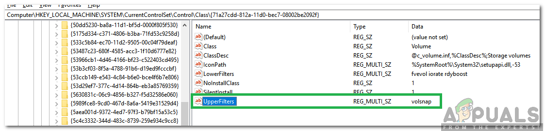 Computer\HKEY_LOCAL_MACHINE\SYSTEM\CurrentControlSet\Control\Class\{71a27cdd-812a-11d0-bec7-08002be2092f} - In the right pane, check to see if “volsnap” value is entered for the “UpperFilters” entry.