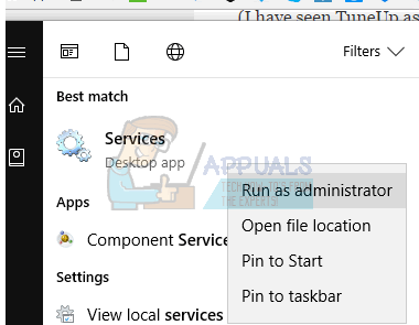 - Open the Start Menu and type “services”. Right-click on it and “Run as administrator”. You can also do this by pressing Windows Key + R for the Run prompt, typing “services.msc” and pressing Enter.