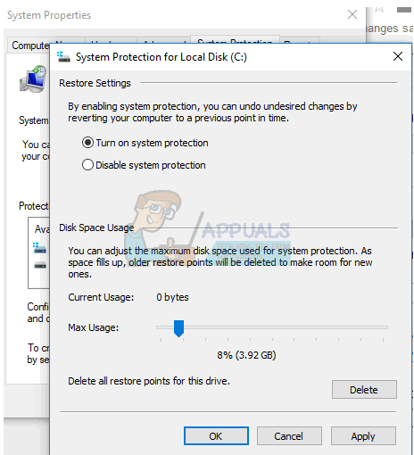 - Open the Control Panel and navigate to System and Security > System Protection and then select the drive, click the Configuration button, and set the Maximum Disk Space usage to something more than zero (depending on the number of restore points you want). Remember to Turn on System Protection from here is you haven’t.