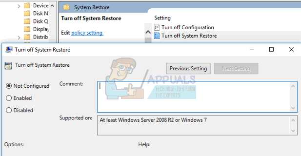 - Double-click on “Turn off System Restore” and select “Not Configured”.