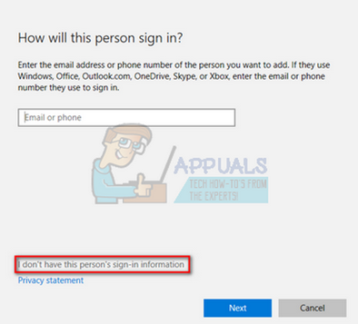 - Now Windows will guide you through its wizard on how to create a new account. When the new window comes forth, click “I don’t have this person’s sign-in information”.