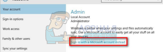 - Now navigate to Settings > Accounts > Your Account and select the option “Sign in with a Microsoft Account instead”.