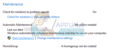 - Press Windows + S to launch the start menu search. Type “maintenance” in the dialogue and select the first result which comes forth.