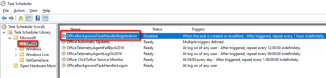 Follow the steps below to disable OfficeBackgroundTaskHandlerRegistration and OfficeBackgroundTaskHandlerLogon from Task Scheduler: