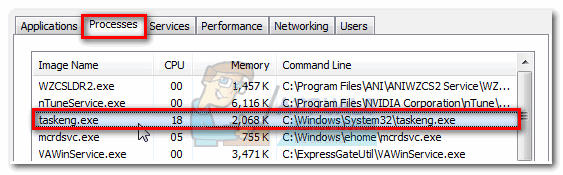 You can identify if this is the case by opening Task Manager ( Ctrl + Shift + Esc) and going to the Processes tab. Once there, locate taskeng.exe and check the Command Line associated with it or right-click on it and choose Open File Location.