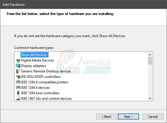 - Click the Next button at the bottom until you see the statement: “If you do not see the hardware category you want, click Show all devices”.