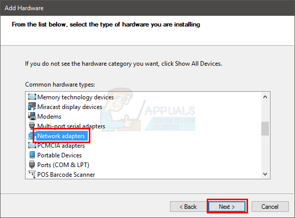 - In the list that appears, locate and left click on Network Adapters and then click the Next button at the bottom.