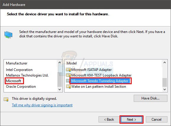- Find and click Microsoft from the left hand pane. Once done, locate and select Microsoft Teredo Tunneling Adapter from the right hand pane and click Next.