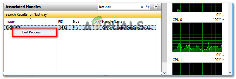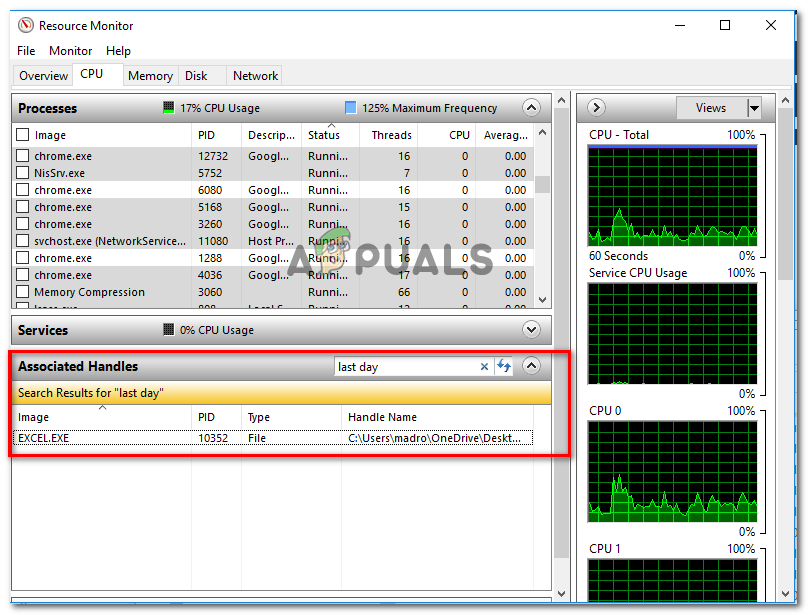 Opening the Resource Monitor from a Run box - Inside the Resource Monitor utility, navigate to the CPU tab, scroll down to Associated Handles. Next, type the name of the file triggering the issue. In our case, the file triggering the issue is named last day.xlsx. So we typed in ‘last day‘ in the search box and discovered that the process using it was Excel.exe.