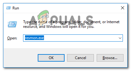 - Press Windows key + R to open up a Run dialog box. Then, type “resmon.exe” and press Enter to open up the Resource Monitor utility.