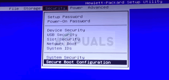 - Use the right arrow key to choose the Security menu when the BIOS settings window opens, use the down arrow key to select the Secure Boot Configuration option, and press Enter.