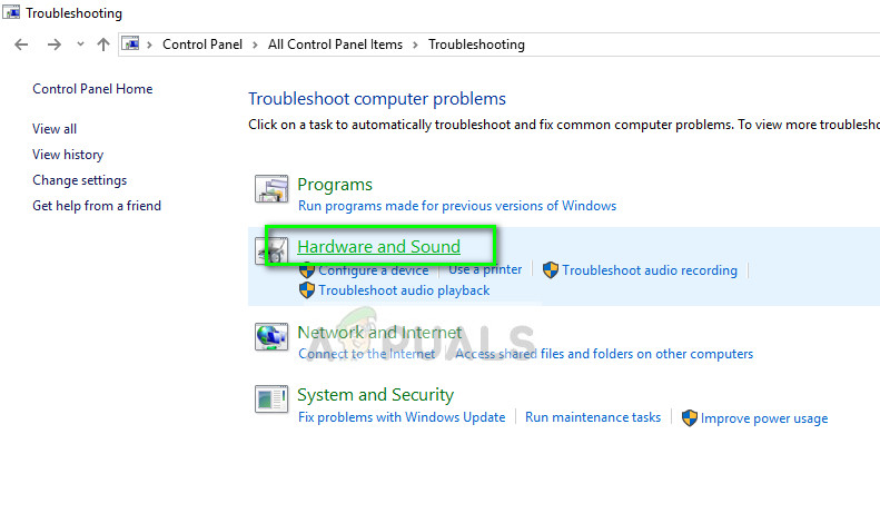 - Now click on Hardware and Sound and from the next page, select Hardware and devices. Now let the troubleshooter perform all the tasks and apply the fix if presented.