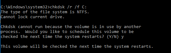 - Press Y and then Enter when you’re prompted in the prompt to check the disk on the next reboot.