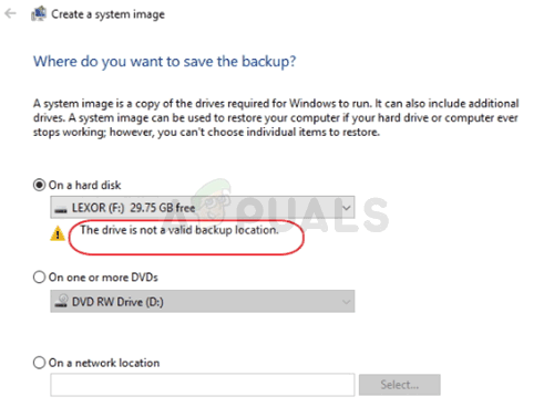 - Click the Create a system image button from the left side menu and check the radio button under the “On a network location” button. Select your username followed by the name of the folder on your USB and input your username and password. Check to see if the “The drive is not a valid backup location” error has ceased to appear!