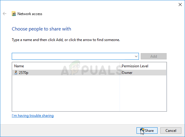 Sharing the folder - Inside the “Choose people to share with” window, choose your own username from the list and click Share at the bottom of the window. You will need to have administrator permissions to do so!