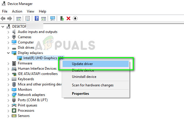 - Once in the device manager, expand the category of Display adapters, locate your hardware, right-click it and select Update driver.