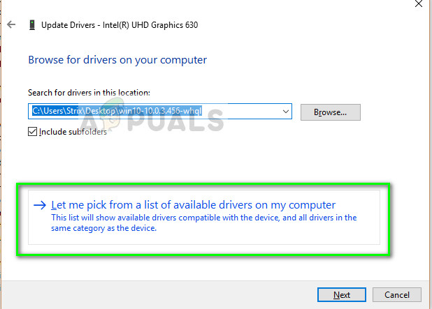 - Select the option “let me pick from a list of available drivers on my computer”. Do not click the browse button at the top.