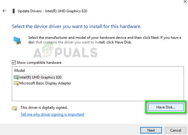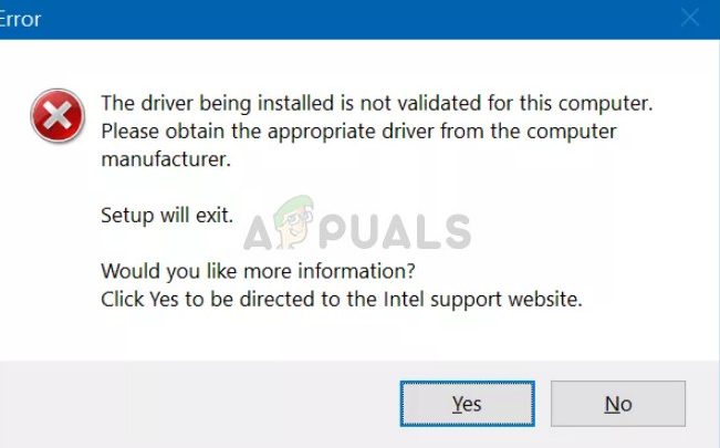 The driver being installed is not validated for this computer is triggered when the driver is not compatible with your GPU or if the vendor has released an update. Intel HD/UHD graphics drivers refuse to install on some computers even if you are using standalone Intel graphics. If this error message pops up, it probably means that the computer manufacturer (HP, Dell etc.) want you to navigate to their website and download the drivers from there instead.