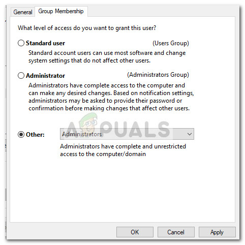 - In the newly opened window, click the Group Membership tab, select Other and use the drop-down menu to select Administrators.
