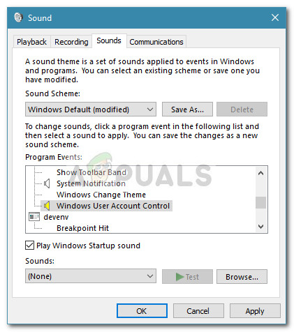 - In the Sound menu, click on the Sounds tab and scroll look for a Windows User Account Control entry under Program Events.