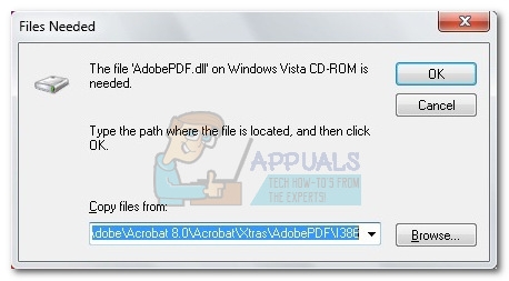 The error “The file AdobePDF.dll is needed” typically appears when the user tries to install an older version of Adobe Acrobat (particularly Adobe Acrobat 8 and Adobe Creative Suite CS3). The user is then given the option to browse for the required file. Most of the time, this issue is triggered on Windows 64-bit operating systems.