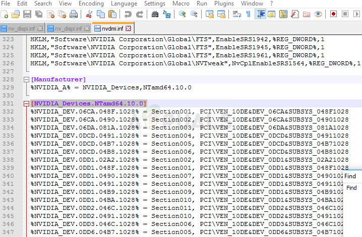 [NVIDIA_Devices.NTx86.8.1] (or NVIDIA_SetA_Devices with similar combinations) %NVIDIA_DEV.0405.01% = Section001, PCI\VEN_10DE&DEV_0405&SUBSYS_15D21043 %NVIDIA_DEV.0405.02% = Section001, PCI\VEN_10DE&DEV_0405&SUBSYS_16341043 %NVIDIA_DEV.0407.01% = Section001, PCI\VEN_10DE&DEV_0407&SUBSYS_080117FF %NVIDIA_DEV.0407.02% = Section002, PCI\VEN_10DE&DEV_0407&SUBSYS_15881043