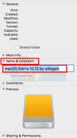 - This step is optional but it will make it easier for you to follow the upcoming instructions if you do this step. You should change the name of the USB drive to MyInstaller. It can have any name but if it has the name MyInstaller then you can simply copy paste the command we will give you in the upcoming steps. So, right click your USB drive and select Get Info. Click the triangle besides Name & Extension. Type the name MyInstaller in the newly appeared textbox under Name & Extension. Once done, press Enter or Tab