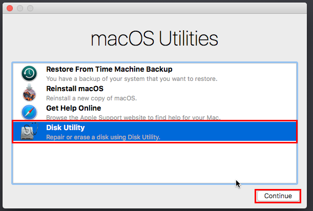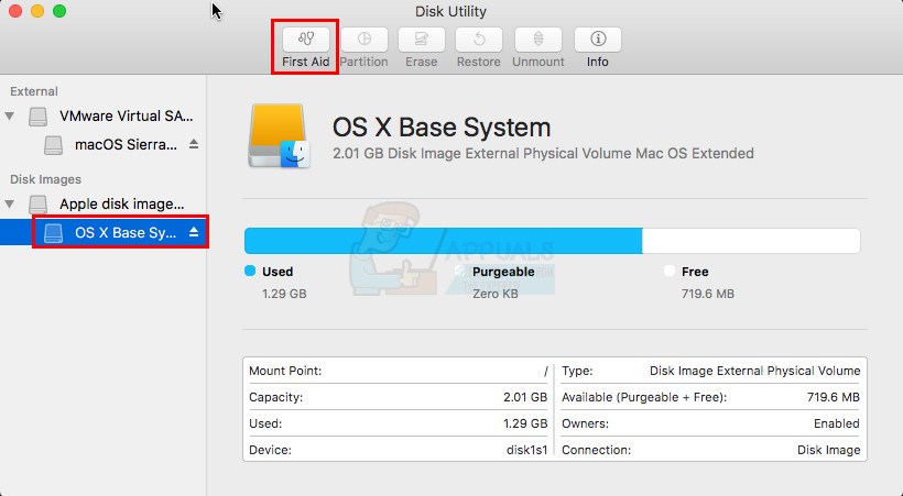 Running First Aid on your internal drive has seemed to work for a lot of users as well. This can be done via the Disk Utility available in Recovery mode. Disk Utility can be used to diagnose and fix problems with a disk or damaged volumes. Follow the steps given below to run a first aid on your internal drive