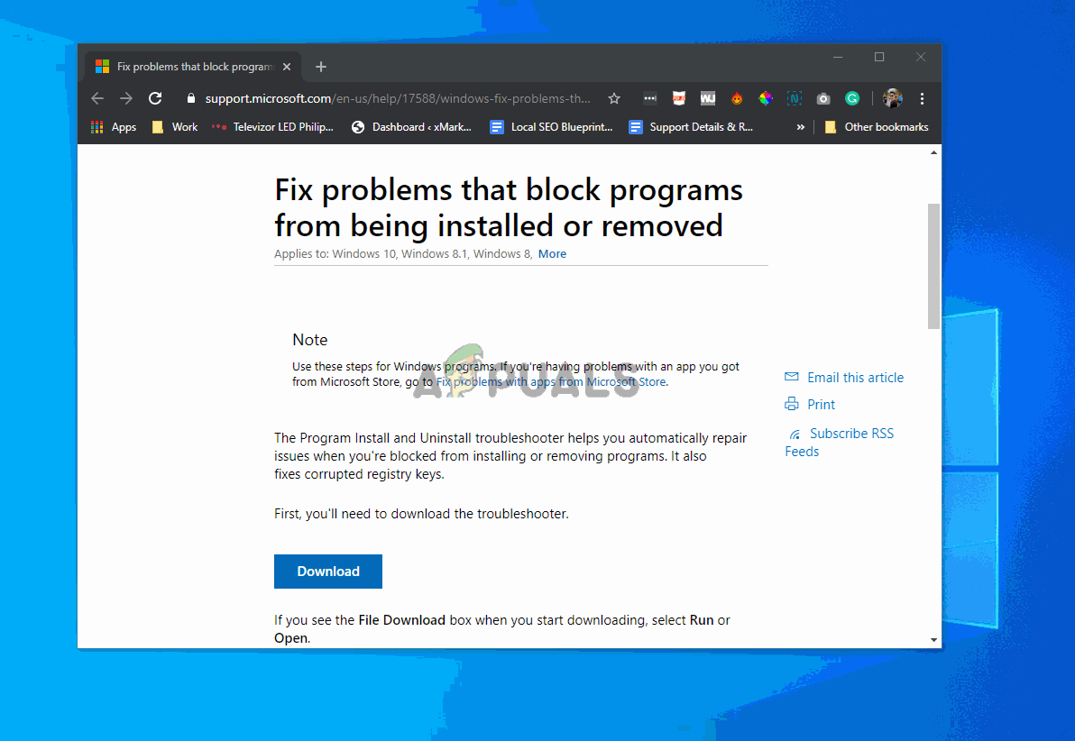 Note: To maximize your chances of success, we recommend that you download the latest version of the Program Install and Uninstall troubleshooter from the official Microsoft Download page.