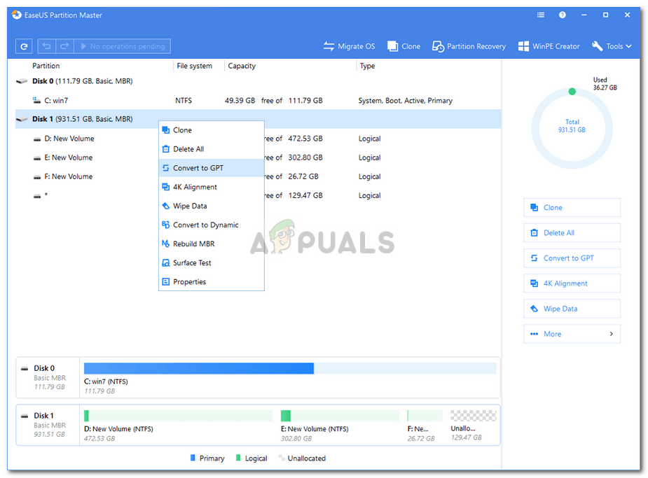 Well, to resolve the issue, we will be using a third-party tool called the EaseUS Partition Master. It is a great tool that you can use to convert disks from MBR to GPT or vice versa, extend, delete or create new partitions using the unallocated space. Follow the steps given down below to convert your disk to GPT: