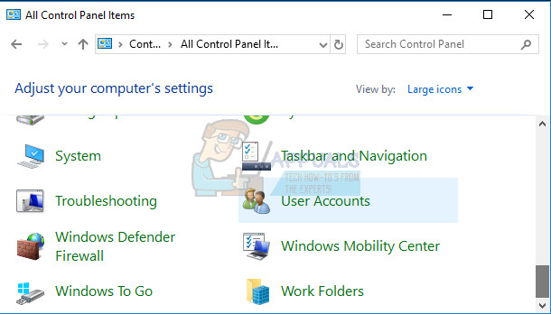 - Switch the View by option in Control Panel to Large Icons and locate the User Accounts option.
